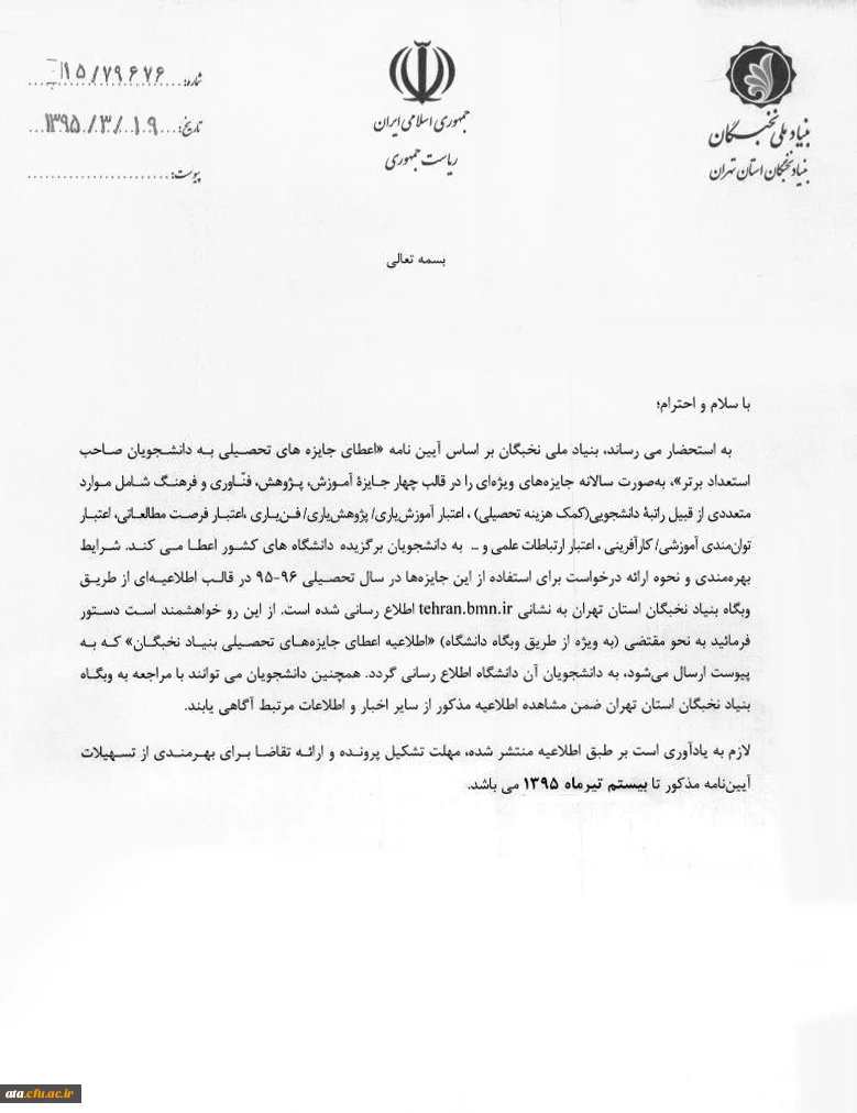 امتیاز دهید : نحوه اعطای جایزه های تحصیلی بنیاد ملی نخبگان به دانشجویان صاحب استعداد برتر 2 پنجشنبه 10 تیر 1395 ساعت 8:57