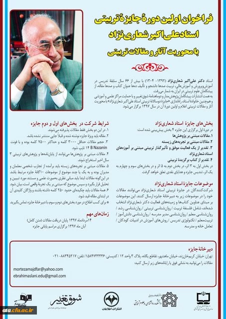 امتیاز دهید : اعلام فراخوان اولین دوره جایزه تربیتی استاد "علی اکبر شعاری نژاد" 2 دوشنبه 29 مرداد 1397 ساعت 9:29