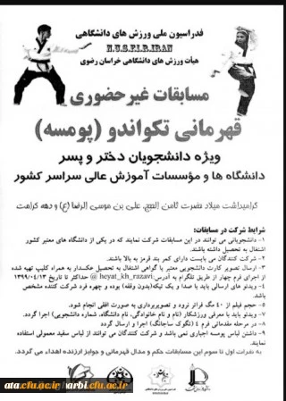 امتیاز دهید : برگزاری مسابقات قهرمانی تکواندو در بخش پومسه (دختر و پسر) 2 یکشنبه 15 تیر 1399 ساعت 12:47