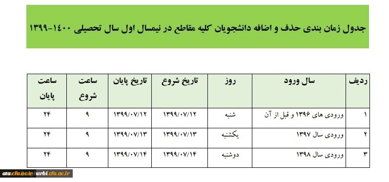 امتیاز دهید : جدول زمان بندی حذف و اضافه دانشجویان کلیه مقاطع در نیمسال اول سال تحصیلی 1400-1399 2 شنبه 12 مهر 1399 ساعت 10:45